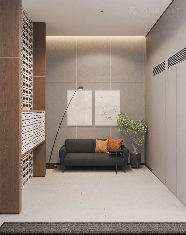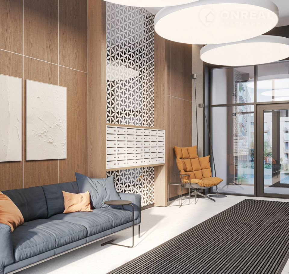 Декоративные перегородки, установленные в лобби, напоминают машрабию — элемент арабской архитектуры в виде узорной решетки. За счет мягкой мебели, многоуровневого освещения теплых оттенков и предметов декора (например, зеркал и картин) холлы воспринимаются как продолжение квартиры.