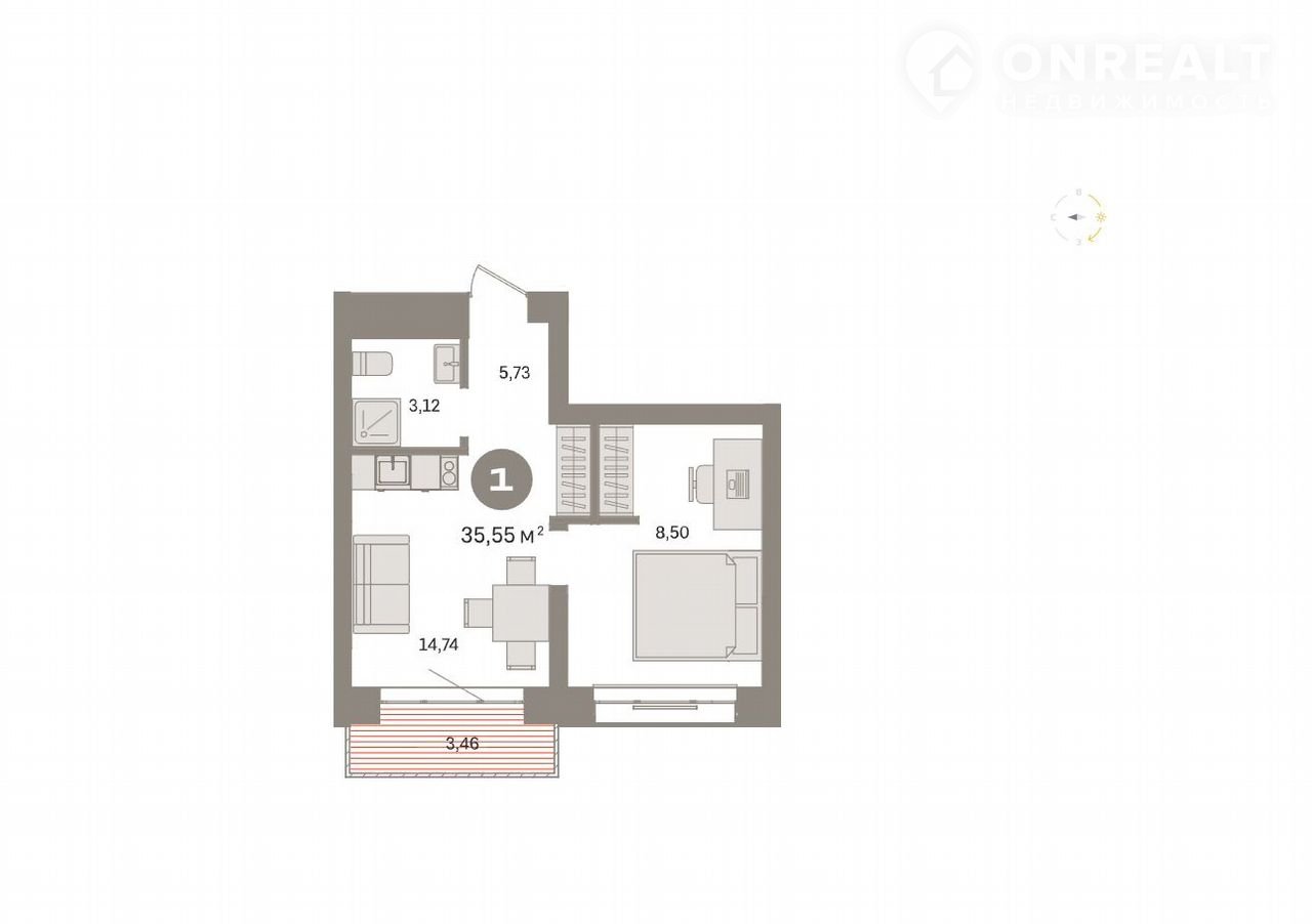 1-комнатная квартира, 35.6 м2, этаж 4 / 6, на продажу в Тюмени, Причальная улица, 7