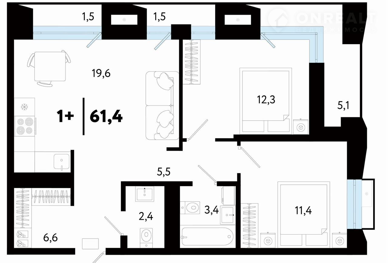 Общая площадь 61.4 м2