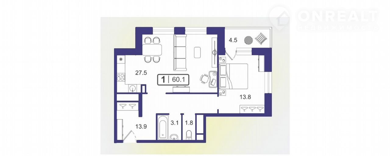 Общая площадь 60.1 м2