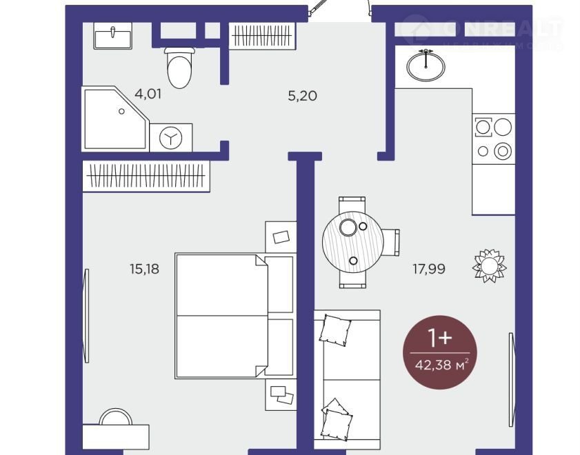 Общая площадь 42.4 м2