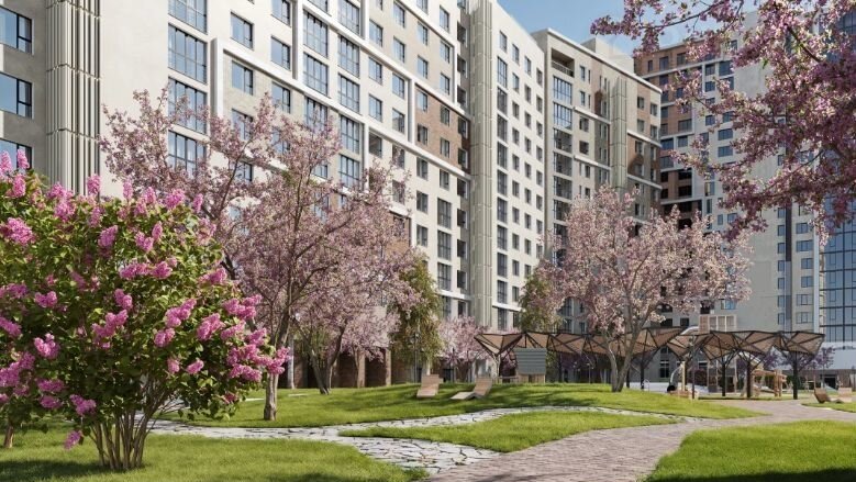 Индивидуaльная архитектура каждого дома. Пешеходный бульвар в центре квартала, арт-объекты, спортивные и детские площадки.