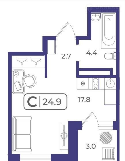 Квартира студия, 32.8 м2, этаж 16 / 22, на продажу в Тюмени