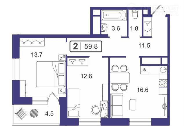Общая площадь 59.8 м2