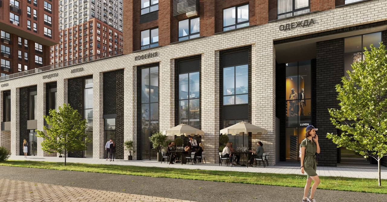 5. Торговые и офисные помещения: На первых этажах со стороны улицы расположены торговые и офисные помещения. В них располагаются полезные сервисы для жителей: магазины, пекарни, кофейни, аптеки, банки, фитнес, парикмахерские, детские клубы.