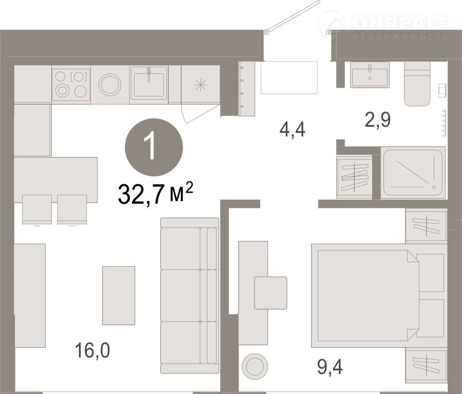1-комнатная квартира, 32.7 м2, этаж 2 / 9, на продажу в Тюмени