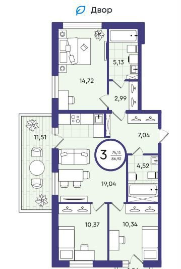 Общая площадь 86.9 м2
