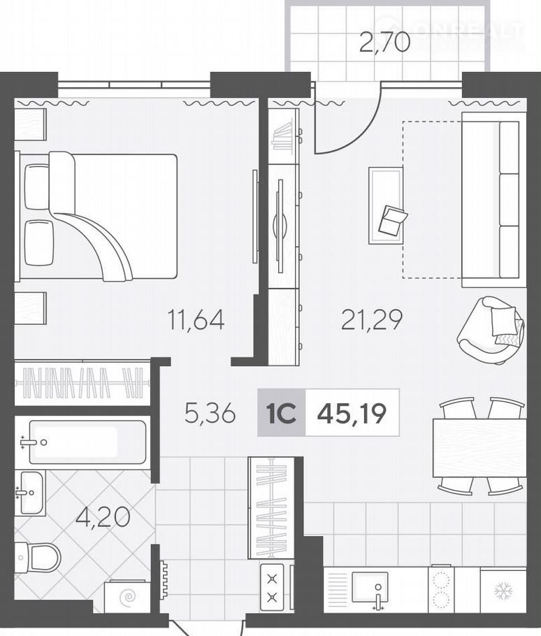 Уютнaя однокомнатная квартира 45.19 кв.м на 3 этаже. Функциональная планировка позволяет удобно организовать быт, а кухня-гостиная подойдёт для отдыха и общения.