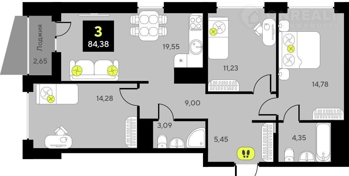 Код предложения ID 737791. 3 комнатная квартира с улучшенной черновой отделкой в монолитно-каркасном доме. Квартира находится на 3 этаже, общая площадь 84.38 кв.м. Дом расположен в г. Тюмень в ЖК Дивный квартал у озера. Срок сдачи дома 3 квартал 2025 года. Квартиру можно купить с помощью: наличных средств, ипотеки