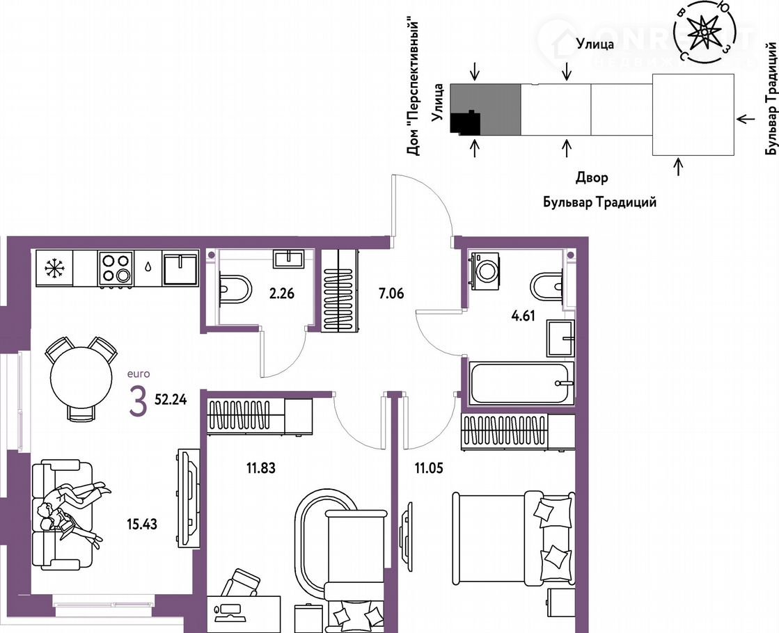 Общая площадь 52.2 м2