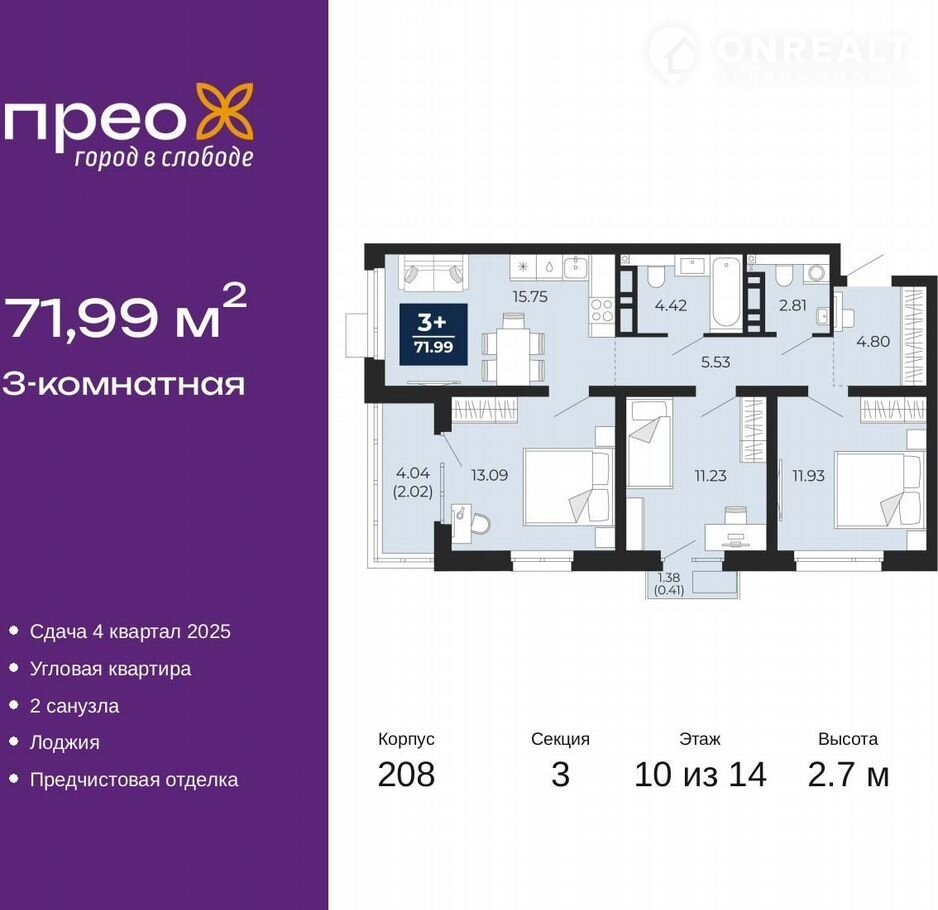Код предложения ID 772085. 3 комнатная квартира с улучшенной черновой отделкой в монолитно-каркасном доме. Квартира находится на 10 этаже, общая площадь 71.99 кв.м. Дом расположен в г. Тюмень в ЖК ЖК Прео. Срок сдачи дома 4 квартал 2025 года. Квартиру можно купить с помощью: наличных средств, ипотеки
