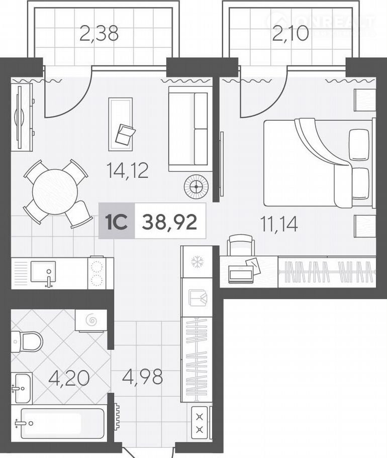 Однокомнатная квартира 38.92 кв.м на 4 этаже с продуманной планировкой. Просторная кухня-гостиная идеально подходит для приёма гостей, а уютная спальня станет личным местом отдыха.