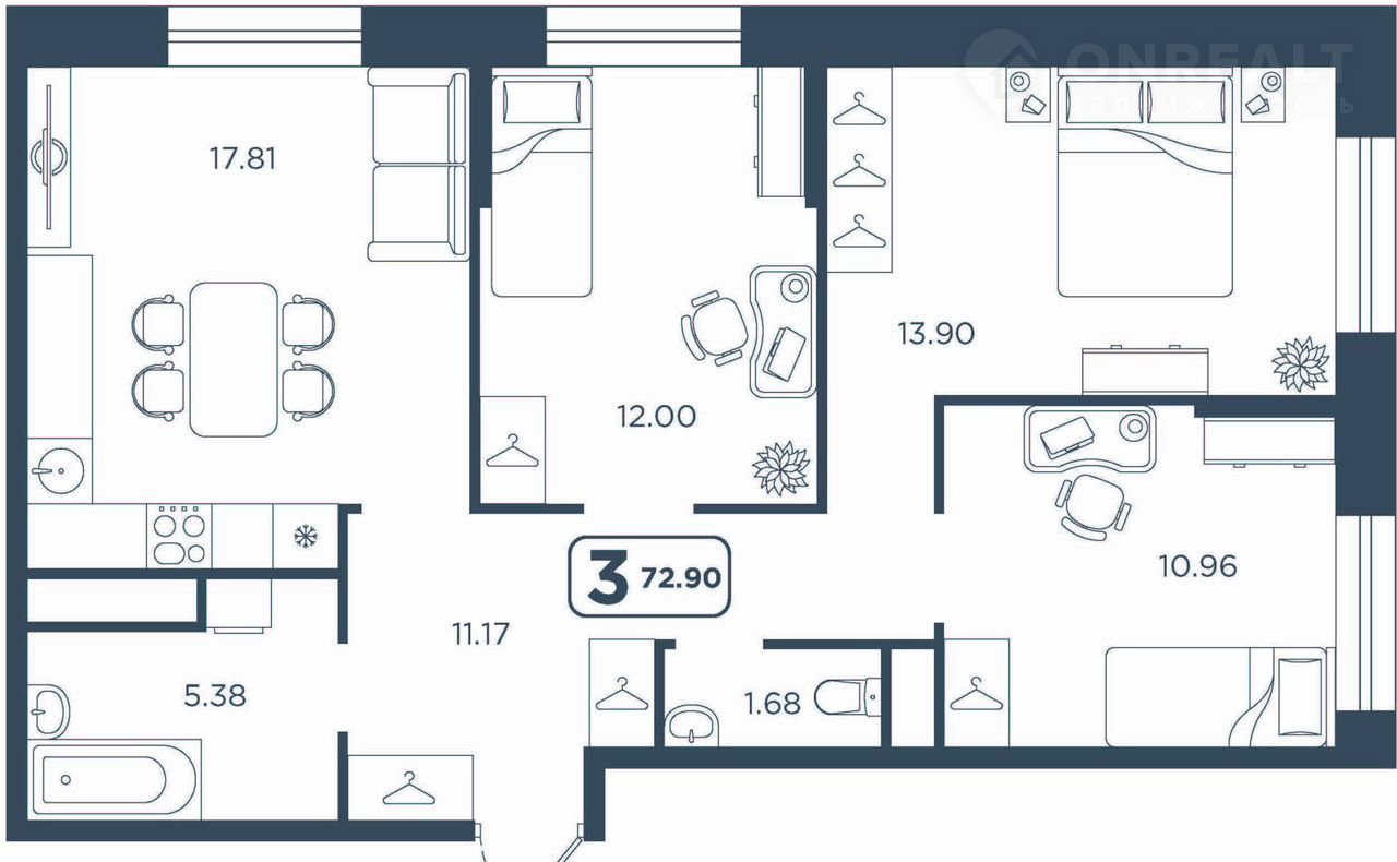 Общая площадь 72.9 м2