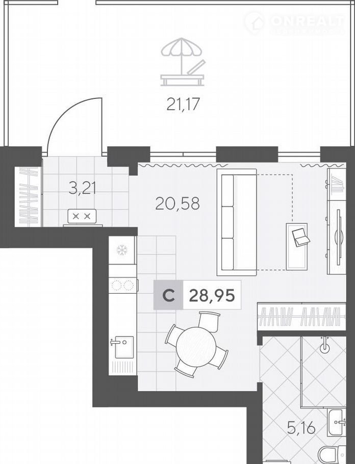 Студия площадью 28.95 кв.м на 1 этаже — хороший вариант для первой квартиры. Функциональная планировка позволит легко зонировать пространство и отделить зону готовки, гостиную и спальню.