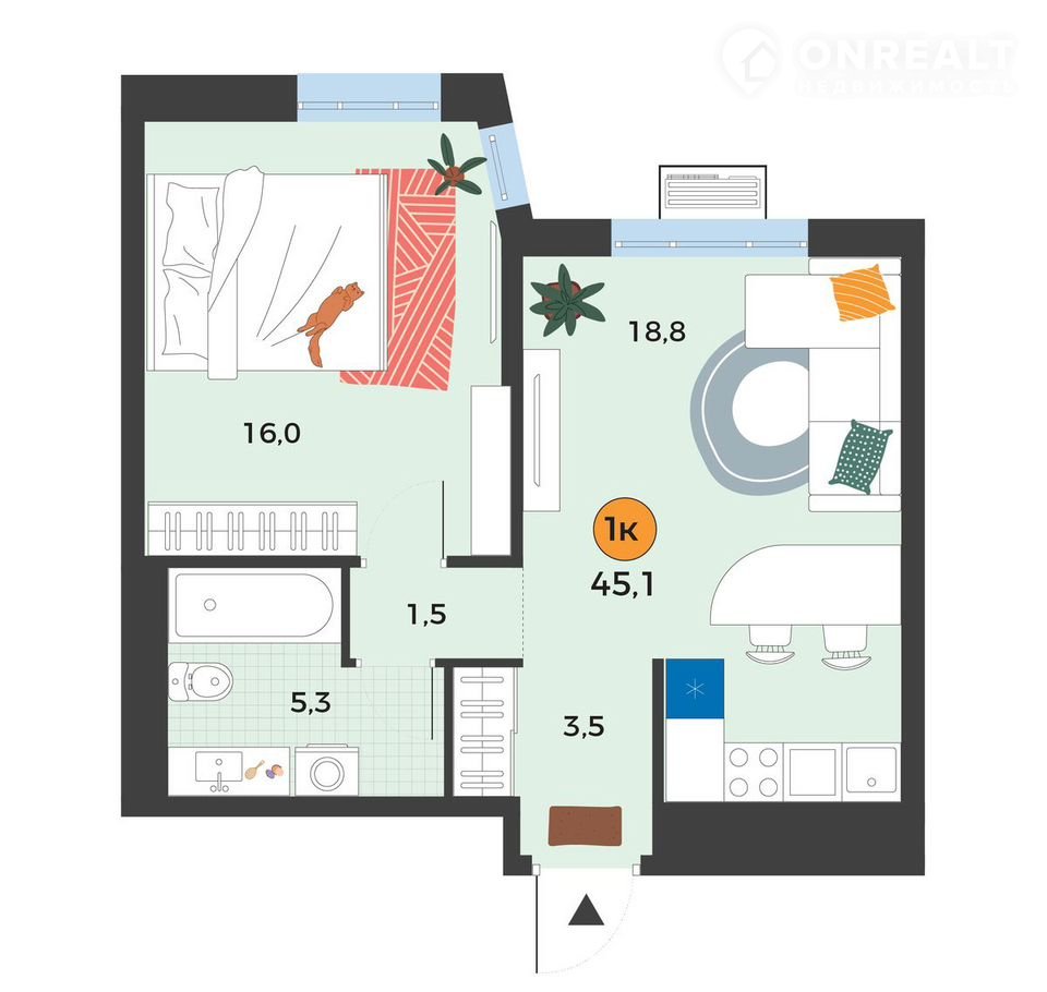 Общая площадь 45.1 м2