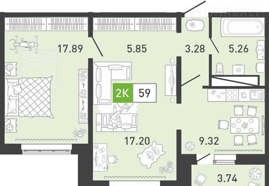 Общая площадь 58.9 м2