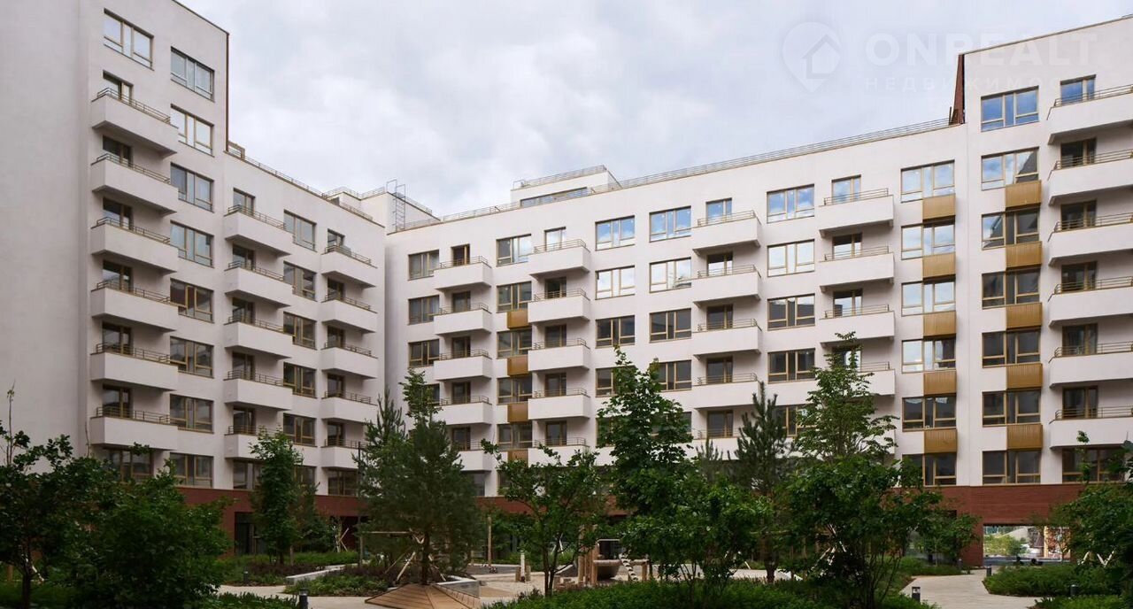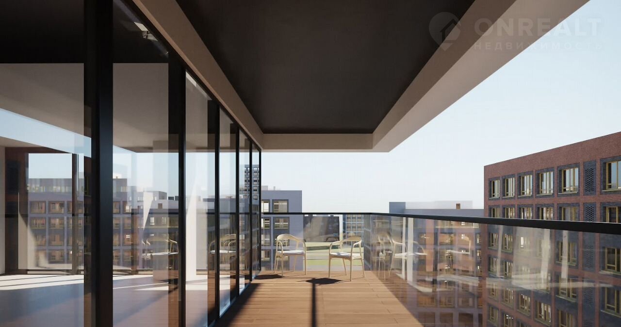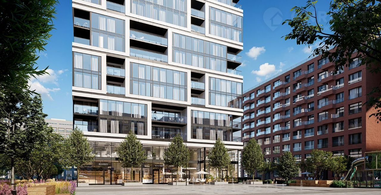 Доминантой территории и новым городским ориентиром станет 24-этажная башня. Она гармонично вписывается в ландшафт благодаря большой площади остекления. Крупные белые рамы окон, переплетаясь, формируют сложный ритм, дополненный углублениями, превращаясь в уютные летние помещения.