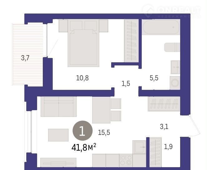 1-комнатная квартира, 41.8 м2, этаж 4 / 9, на продажу в Тюмени