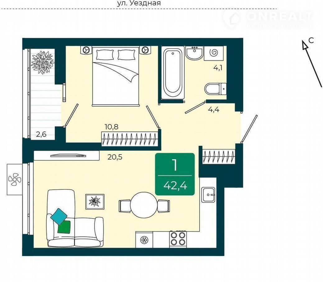 Общая площадь 42.4 м2