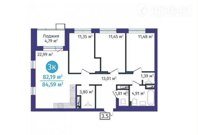 Общая площадь 82.2 м2