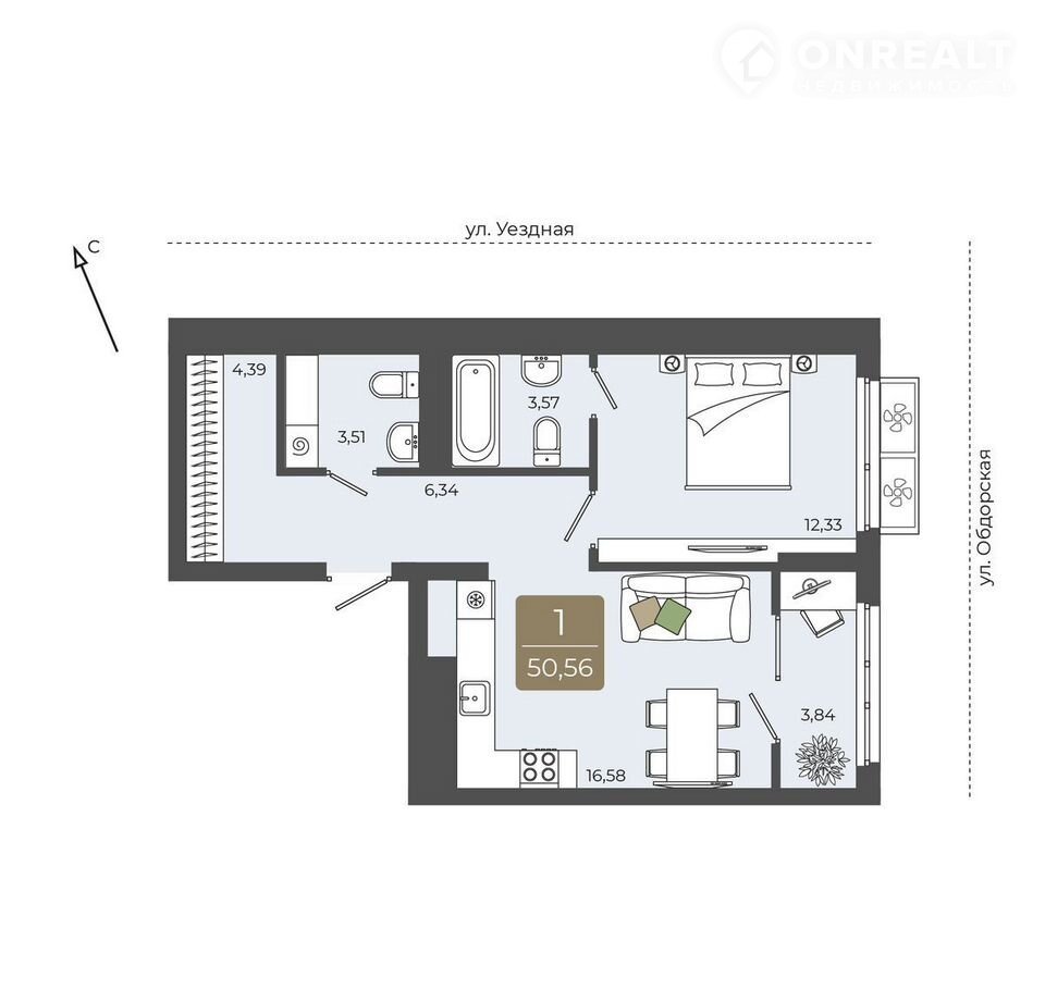 1-комнатная квартира, 50.6 м2, этаж 3 / 15, на продажу в Тюмени