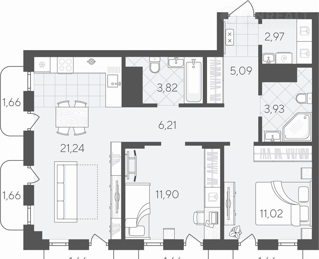 Квартира с двумя спальнями площадью 74.48 кв.м на 17 этаже с продуманной планировкой. Площадь квартиры условно разделена на гостевую зону и личное пространство только для вас и вашей семьи.