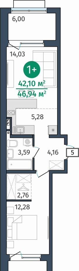 Общая площадь 42.1 м2