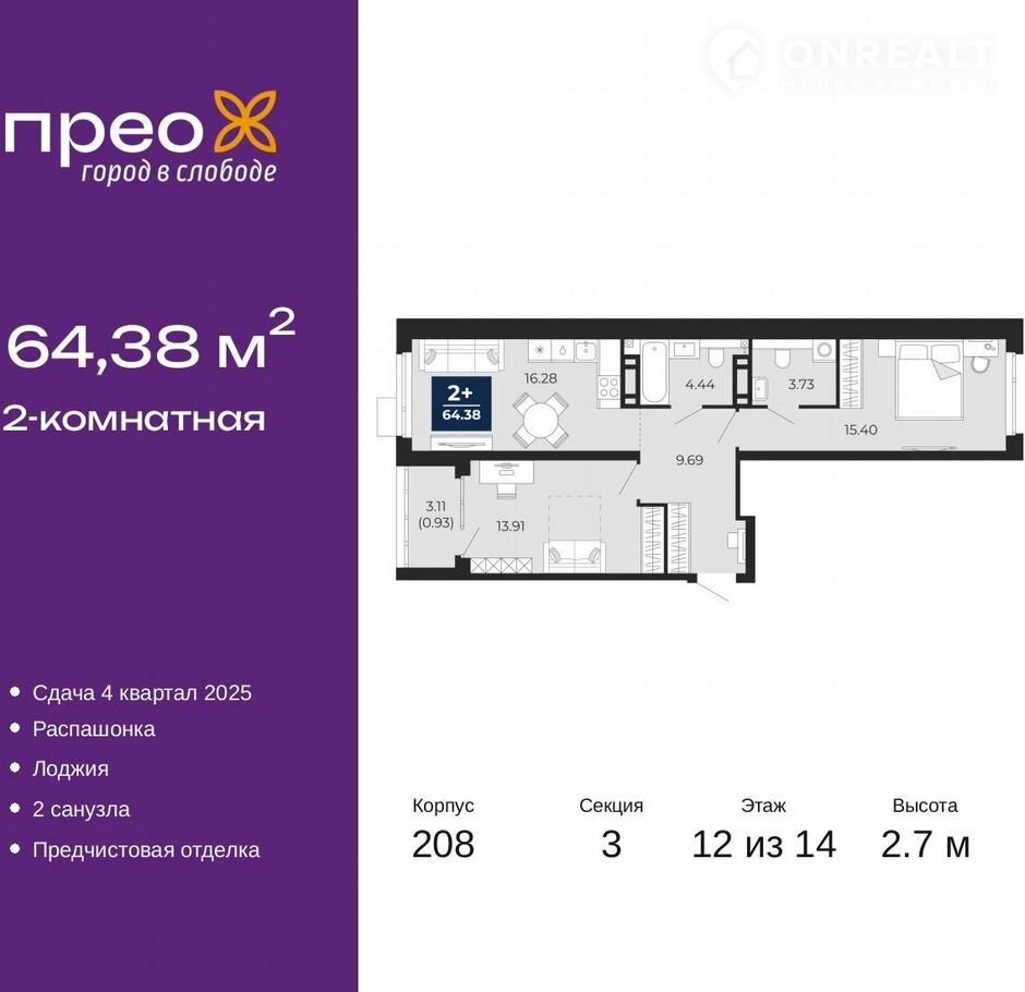 Код предложения ID 772104. 2 комнатная квартира с улучшенной черновой отделкой в монолитно-каркасном доме. Квартира находится на 12 этаже, общая площадь 64.38 кв.м. Дом расположен в г. Тюмень в ЖК ЖК Прео. Срок сдачи дома 4 квартал 2025 года. Квартиру можно купить с помощью: наличных средств, ипотеки