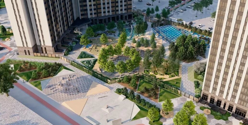 Дома в форме трилистника с просторным лифтовым холлом, куда можно подняться на одном из девяти лифтов.