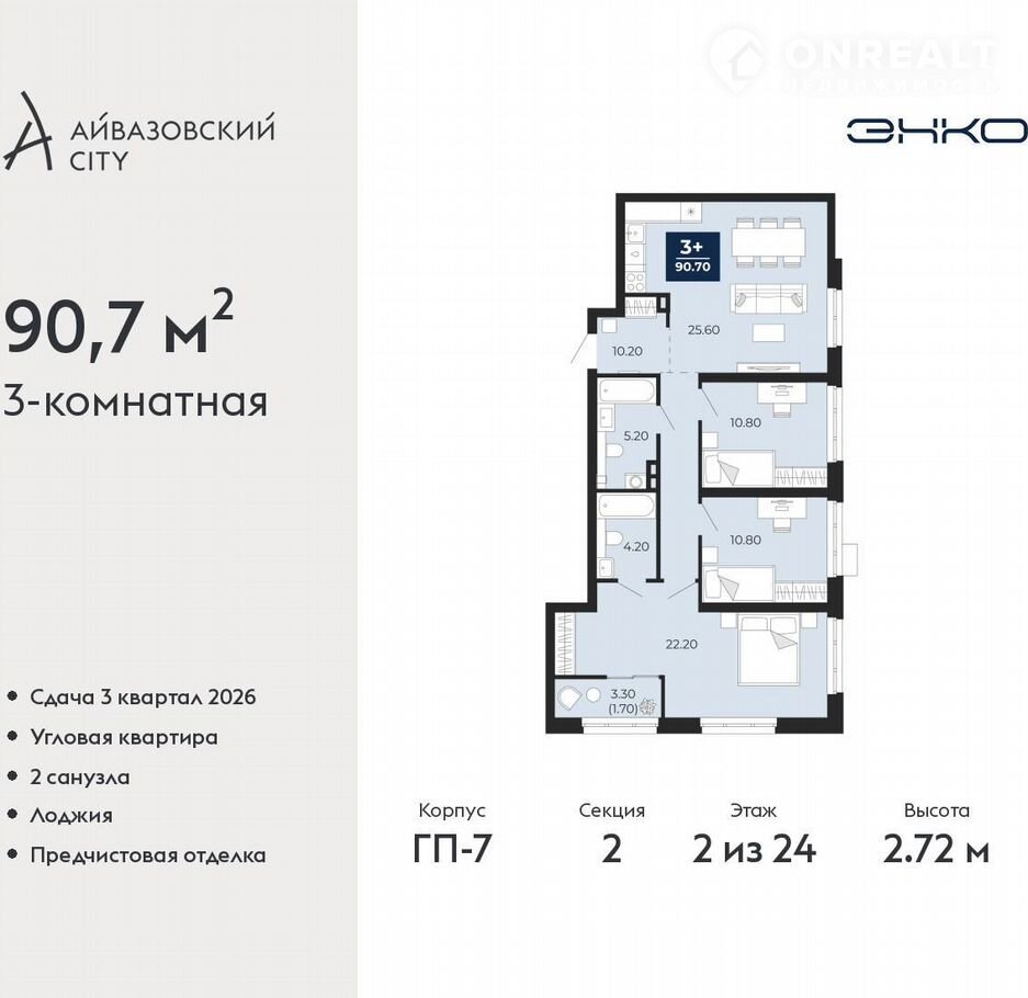 Код предложения ID 771784. 3 комнатная квартира с улучшенной черновой отделкой в монолитно-каркасном доме. Квартира находится на 2 этаже, общая площадь 90.7 кв.м. Дом расположен в г. Тюмень в ЖК Айвазовский Сити. Срок сдачи дома 3 квартал 2026 года. Квартиру можно купить с помощью: наличных средств, ипотеки