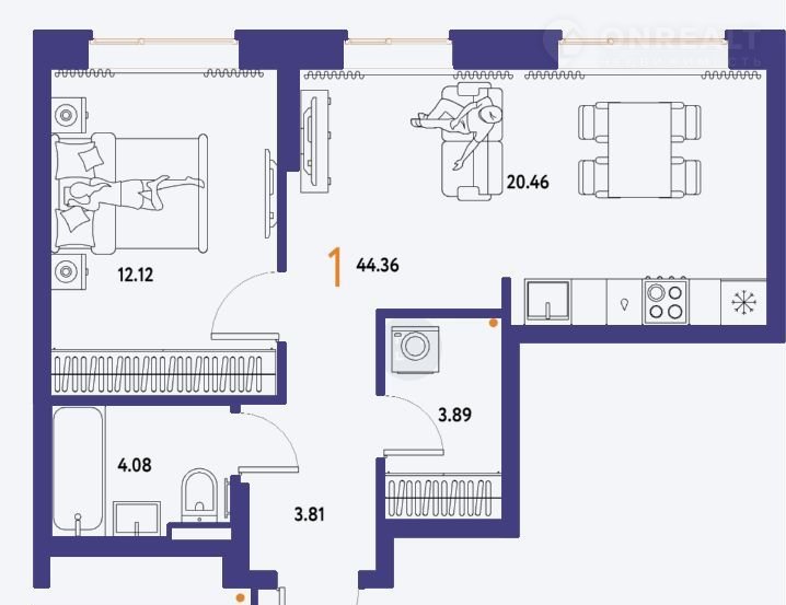 1-комнатная квартира, 44.3 м2, этаж 7 / 13, на продажу в Тюмени, улица Новосёлов, 104