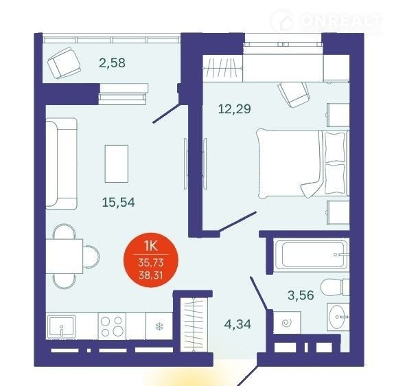 Общая площадь 38.3 м2