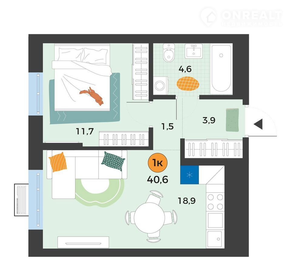 Общая площадь 40.6 м2