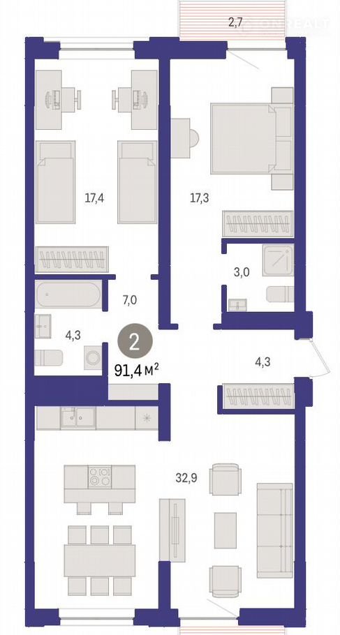 2-комнатная квартира, 91.4 м2, этаж 4 / 8, на продажу в Тюмени