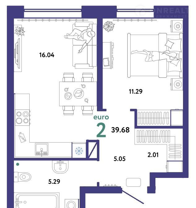 2-комнатная квартира, 39.7 м2, этаж 6 / 16, на продажу в Тюмени