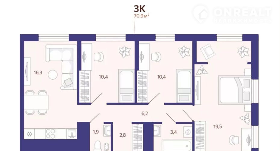 • Три спальни правильной формы.
