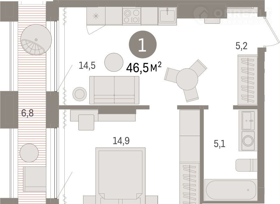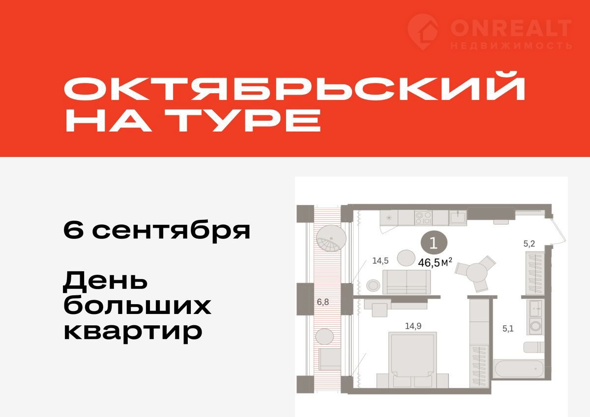 1-комнатная квартира, 46.5 м2, этаж 17 / 17, на продажу в Тюмени