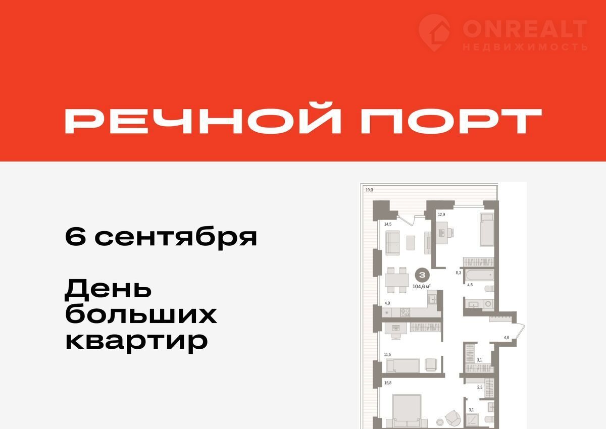 3-комнатная квартира, 104.6 м2, этаж 8 / 9, на продажу в Тюмени