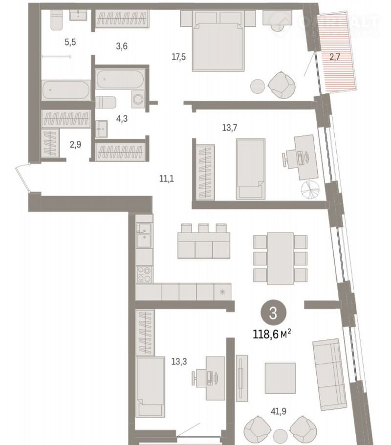 3-комнатная квартира, 118.4 м2, этаж 5 / 10, на продажу в Тюмени