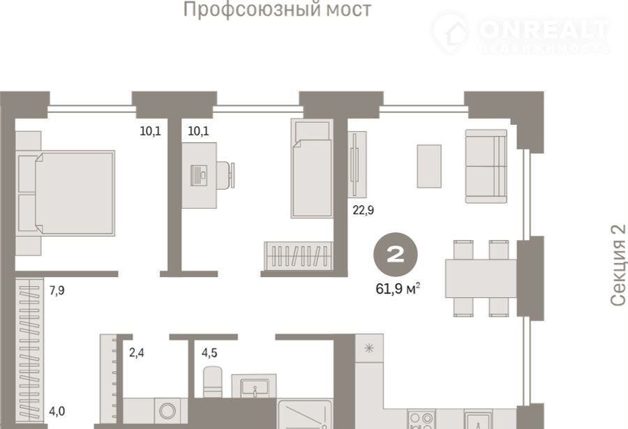 2-комнатная квартира, 61.9 м2, этаж 2 / 9, на продажу в Тюмени