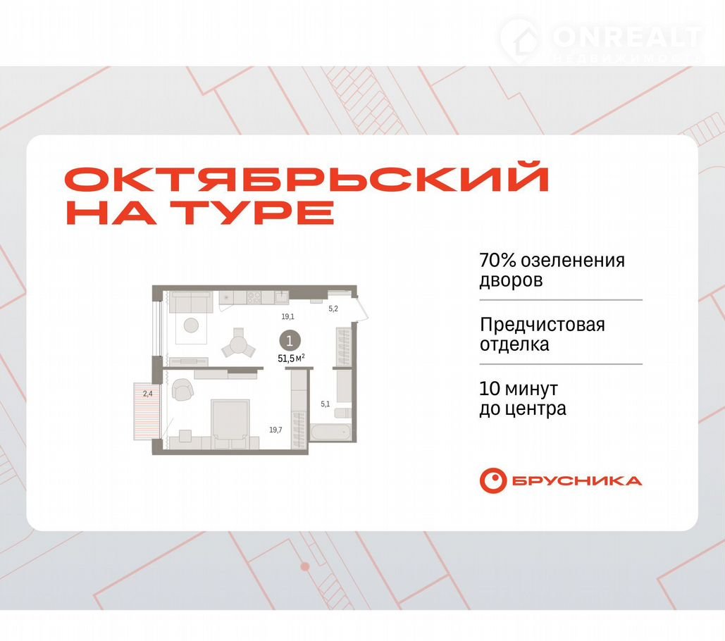 1-комнатная квартира, 51.5 м2, этаж 13 / 17, на продажу в Тюмени