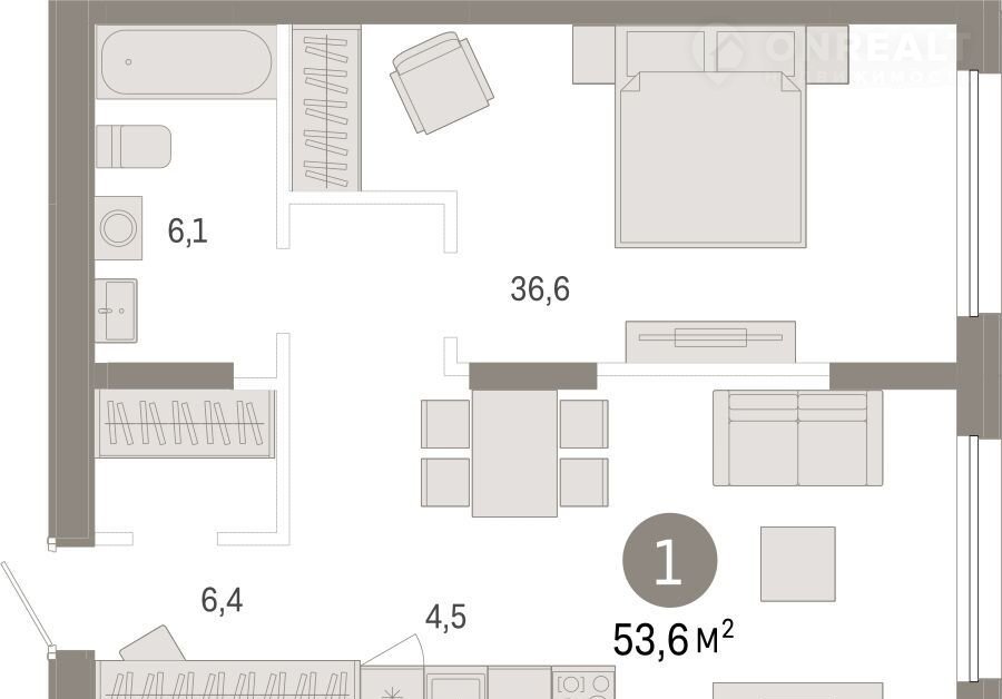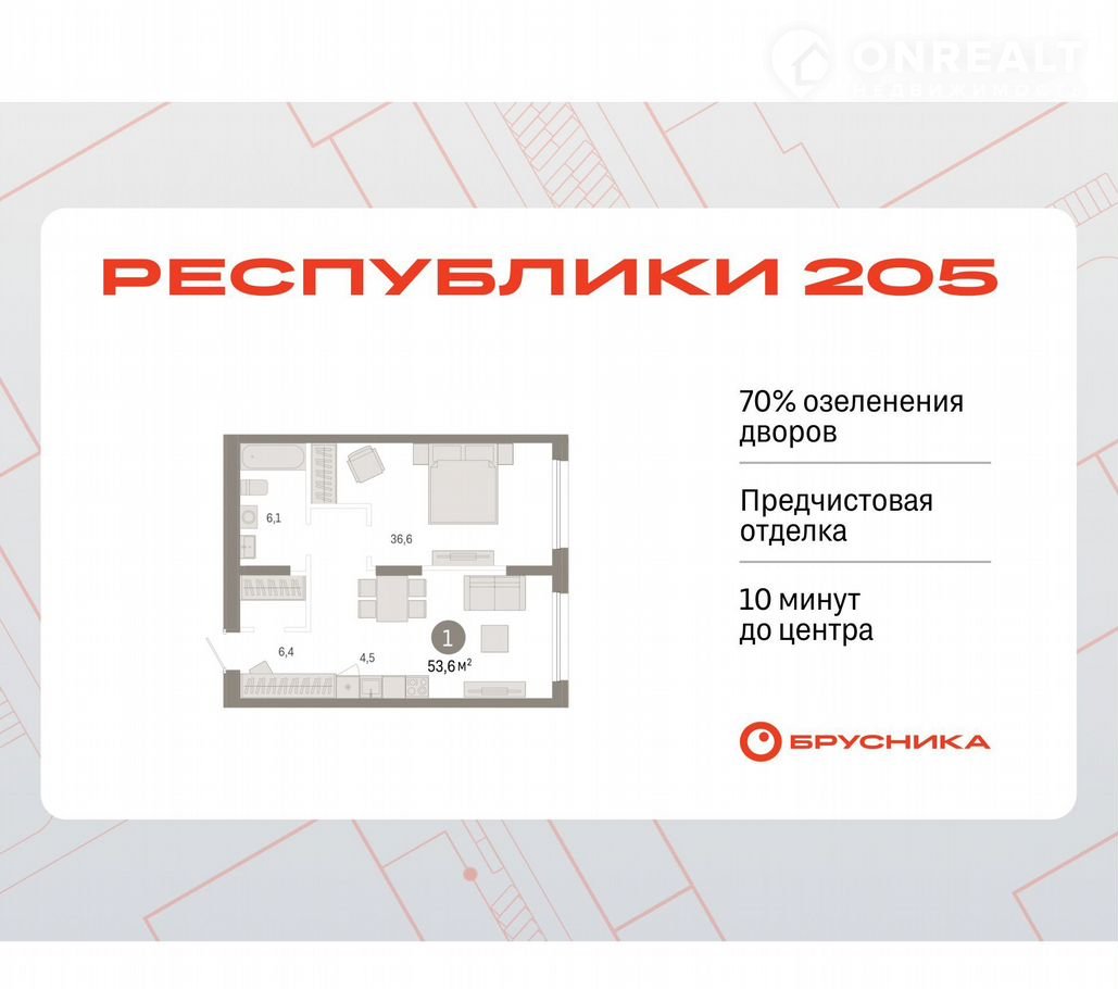 1-комн. квартира с первичной отделкой в ЖК «Республики 205" на 6 этаже. Общая площадь: 53.55 кв.м., жилая: 36.6 кв.м., площадь кухни: 4.5 кв.м. Все окна выходят на одну сторону. В квартире один совмещенный санузел. Высота потолков 2.6 м.