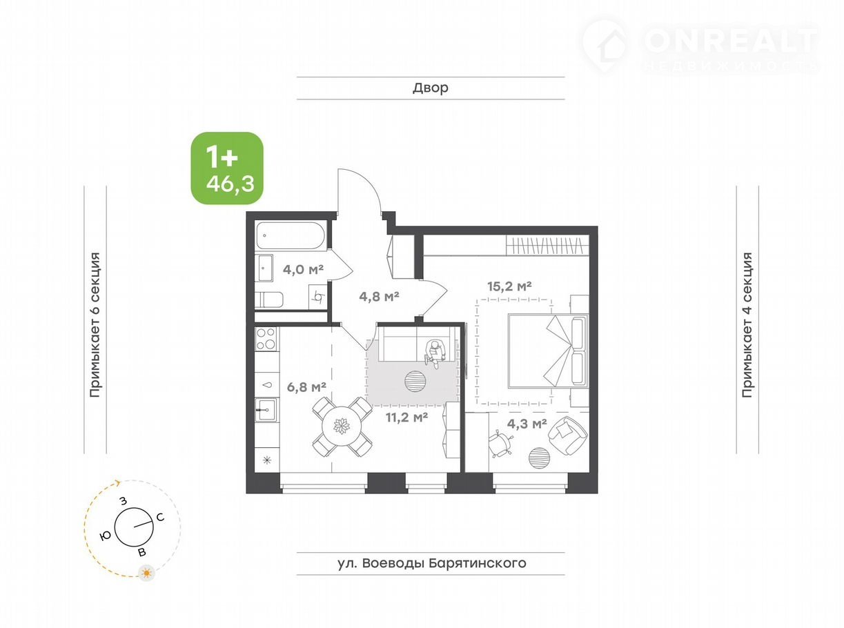 Общая площадь 46.3 м2