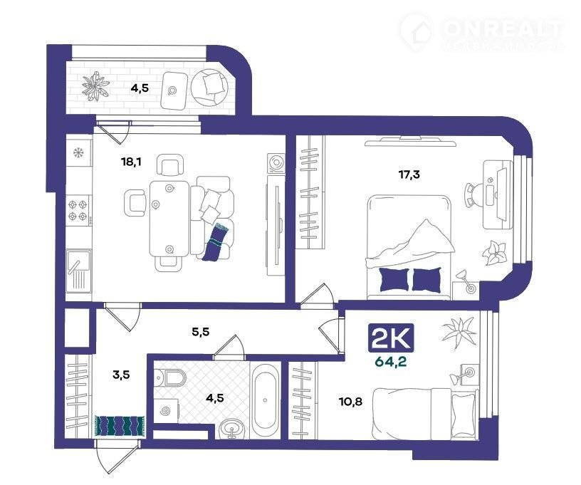 Общая площадь 64.2 м2