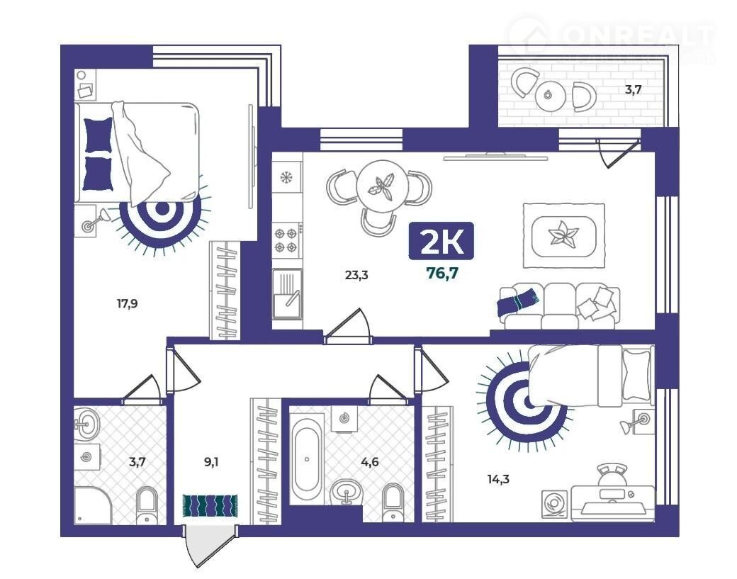 Общая площадь 76.7 м2