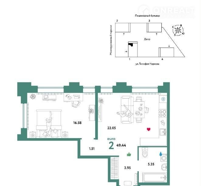 Oбщая площaдь кваpтиры 49,4 м2;