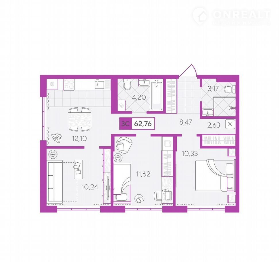 Общая площадь 62.8 м2
