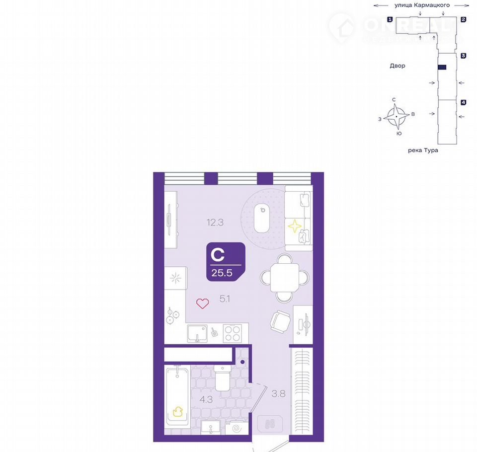 Квартира студия, 25.5 м2, этаж 9 / 25, на продажу в Тюмени