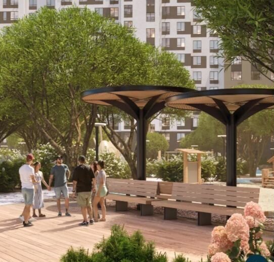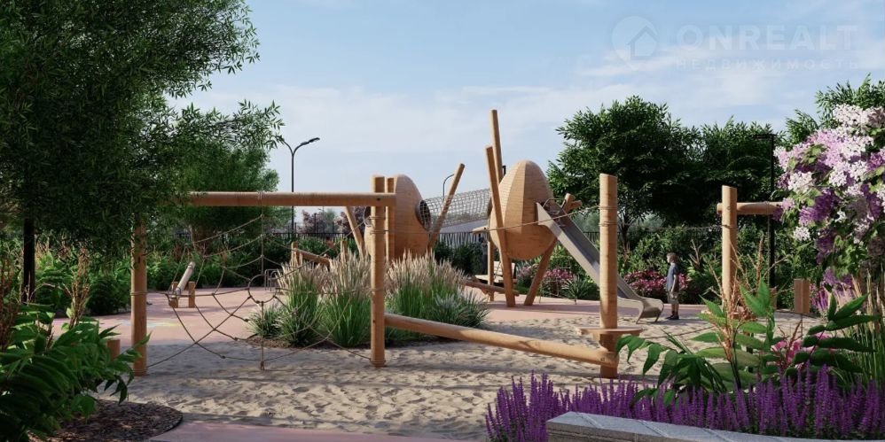 - Двор закрытый без машин, разноуровневое освещение, озеленение, видеонаблюдение, арт-объекты, спортивная площадка, вечно зеленые деревья