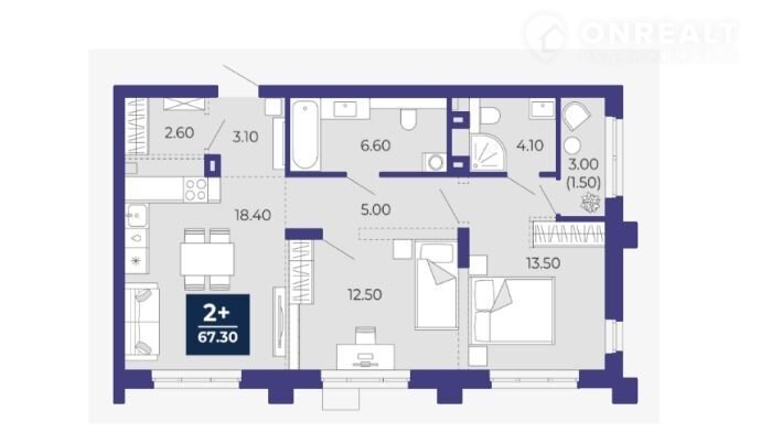 Общая площадь 67.3 м2